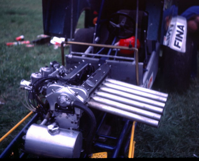 Soyons sérieux c’est une auto qui ressemble à une voiture de compétition et l'ont était là pour se fendre la pêche, (le seule qui possédait une vrai voiture c’était Pascal.S vous connaissez, une HEMI !!)...Mais ce fut des années sympa, nous étions partout, les anglais ramassaient les primes, ont nous payaient les déplacements et nous étions les vedettes ! La pipe d’admission a changé quand même le fonctionnement du moteur et il a trouvé quelques chevaux ! Nous descendions par la route avec la caisse à outils, et en général à quatre ou cinq autos...c’était un régal sur les routes car si le premier doublait, c’était pied dedans pour les trois autres, Un vrais bonheur de voir les quatre caisses, avec un ensemble parfait, se décaler pour doubler et rentrer dans le trou suivant et nous savions que si le premier doublait , c’était bon pour la file, voila un petit condensé de cette période !