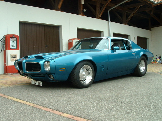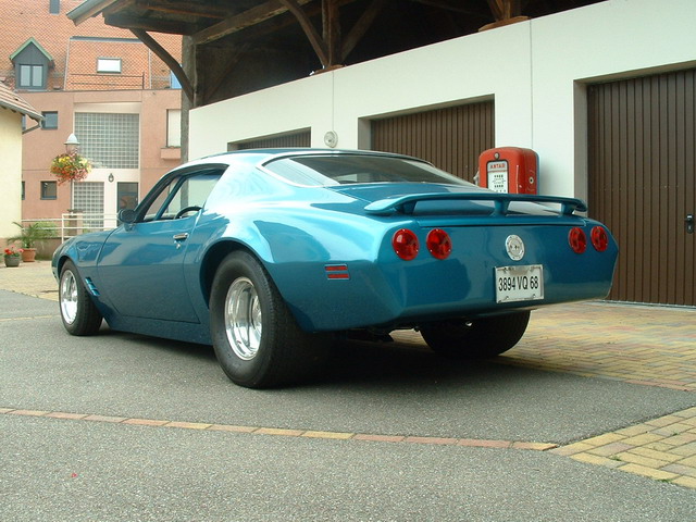 - La première ricaine qu'il a achetée, il l'a possède encore puisque c'est en effet cette superbe PONTIAC Firebird de 1973 bleue, qui a subi un traitement "street machine" assez poussé, légèrement orienté "course" avec ces arceaux, ses larges pneus arrière et sa  hauteur de caisse très basse....bref une gueule bien agressive qui ne passe pas inaperçu !