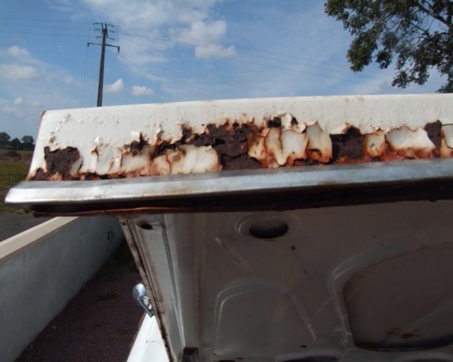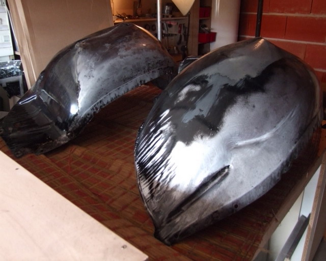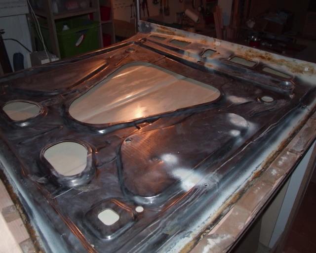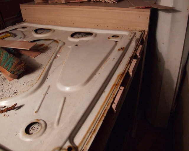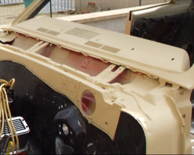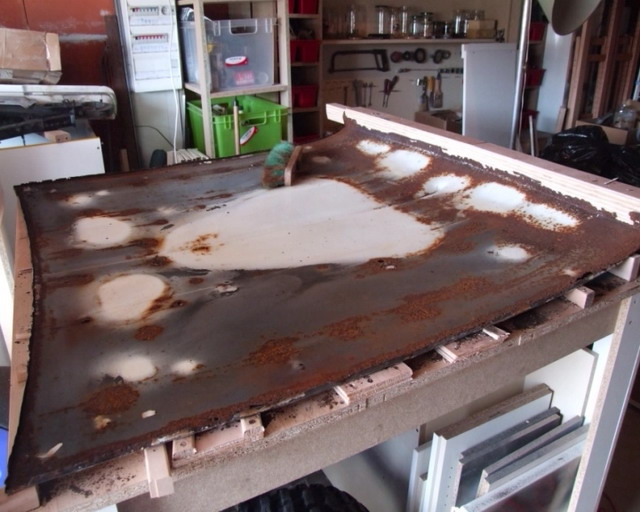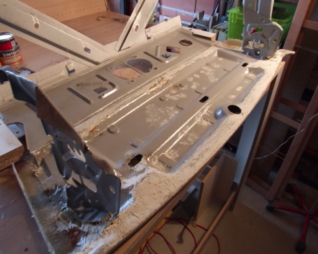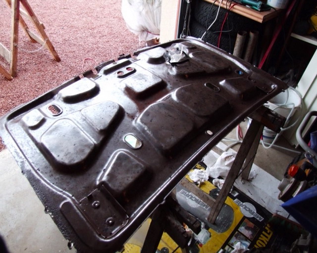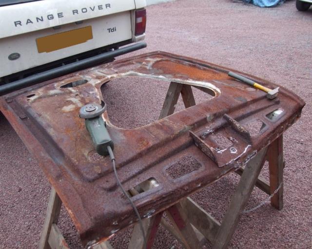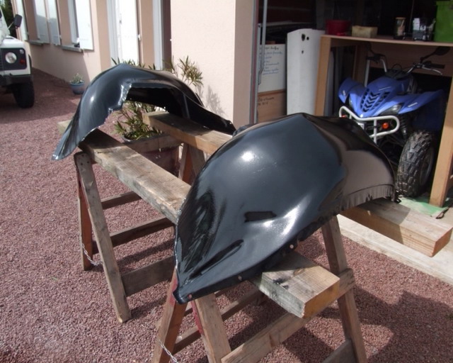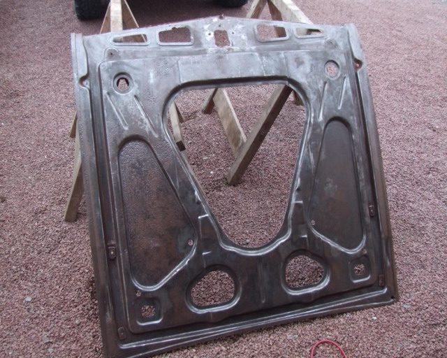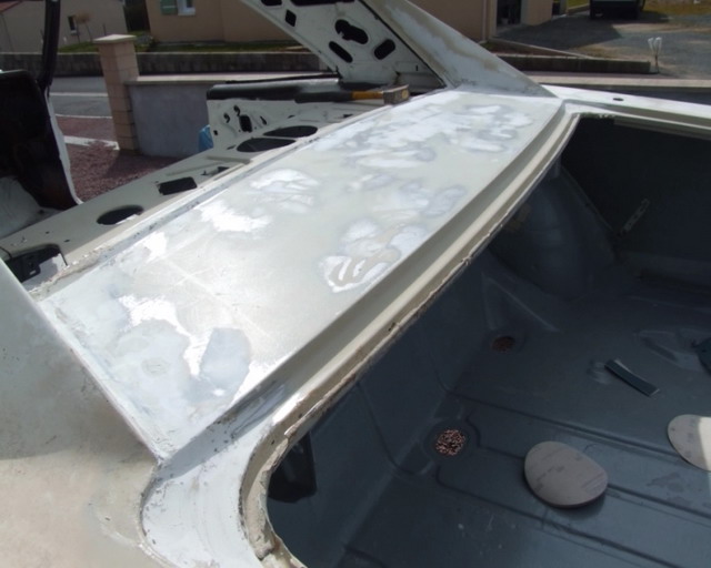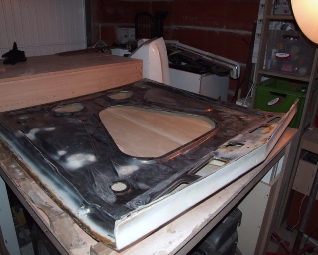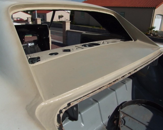 J'ai desserti les tôles du capot avant et arrière pour les décaper, les traiter à l'antirouille, et je les aient recolées ensembles après avoir effectué un traitement polyester... (un boulot de dingue pour lequel il faut faire des gabarits pour être sur de ne pas déformer les tôles au remontage); j'ai découpé la custode arrière entre les montants de vitres pour tout refaire en résine car malheureusement je ne maitrise pas la soudure sur tôle pour laquelle il me faudrait un T.I.G (poste à soudure), alors je le fait à l' américaine, au polyester...ce n'est pas le top mais bon, l'essentiel, c'est de se faire plaisir !