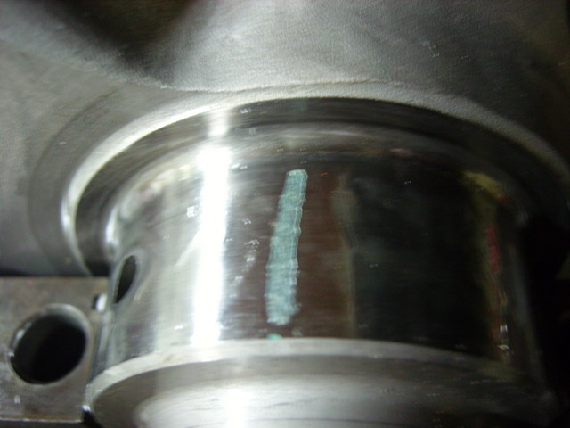 Le test que vous allez voir ici n'est pas génial, même s'il reste dans la tolérance d'épaisseur de jeu entre le vilo et le coussinet, car il démontre que le palier est légèrement incliné de travers vers l'avant du moteur...maintenant je vous rassure, ce test de plastigage est réalisé dans une échelle de mesure au micron, aussi j'ai considéré que cela ne représenterait pas un danger pour la mécanique qui à d'ailleurs tournée avec ce palier qui n'est pas ajusté parfaitement, pendant plus de 10 ans sans CASSER et que le coussinet est aussi là pour s'ajuster aux petits défauts éventuels....Ce qu'il ressort maintenant de ce test, c'est que ce block n'est pas un vrai 4 boulons et qu'il à été modifié il y a longtemps mais pas correctement...