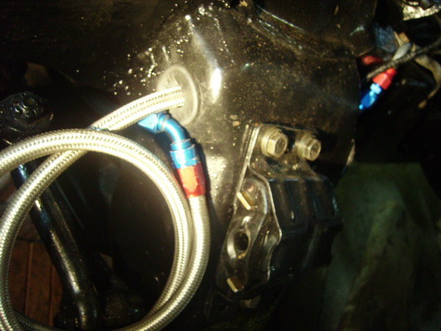 Je suis pour l'instant dans l'attente d'un kit de type souple avec raccords aéroquip AN, pour les tuyaux de l'huile de la boite automatique jusqu'au radiateur, je n'ai donc pour l'instant pas relié le convertisseur au volant moteur pour pouvoir faire mes essais moteurs, (1,5 cms d'espace entres les deux mais par sécurité on peut toujours fixer un pâte de blocage sur la boite pour bloquer le convertisseur si l'on craint que ces 2 pièces ne viennent se frotter mais perso, cela ne semble pas utile car sur la Pontiac, cela n'a pas bougé d'un mm !)