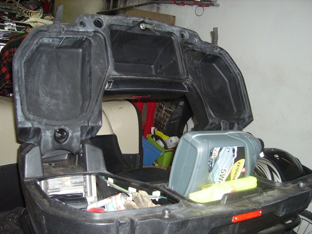 Le coffre permet de ranger 2 casques, Un gros bidon de 5 litres d'huile ou d'essence et différentes choses utiles comme des outils, des kits de réparation de pneus (système de mêche !) etc...