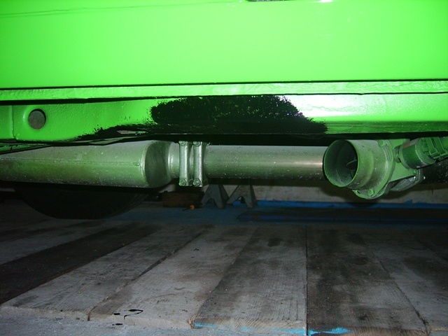 Cette photo vous montre ensuite l'auto repeinte, de retour dans mon garage et sur laquelle j'expose le dessous qui a malheureusement reçu de la peinture verte un peu partout, faute d'une protection suffisantes, alors que j'avais tout restauré en dessous....bon ce n'est pas trop grave...mais je vais devoir repeindre en noir ce qui le doit, et nettoyer mes échappements....Disons pour la forme qu'on est sur que la belle ne rouillera pas vue les 3 ou 4 couches de peintures !!!